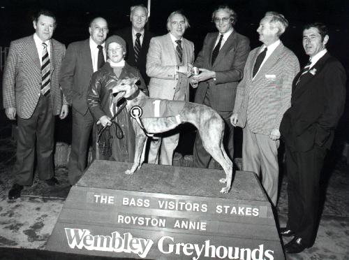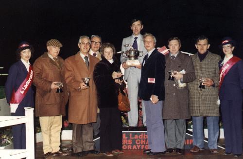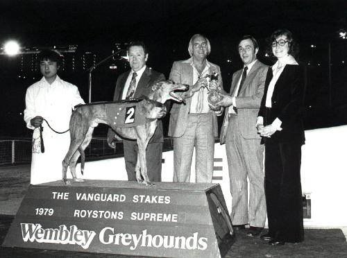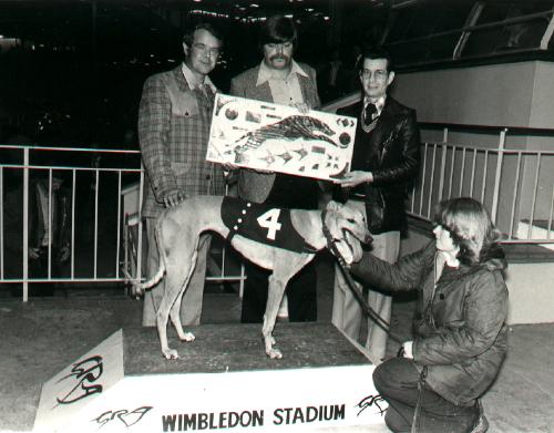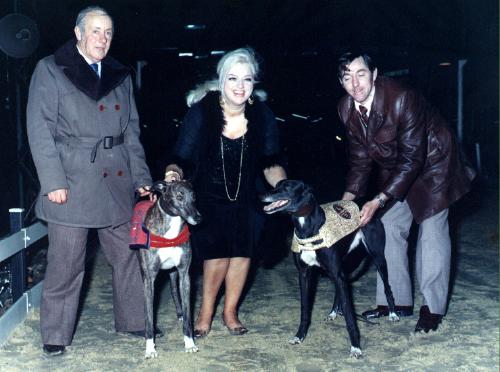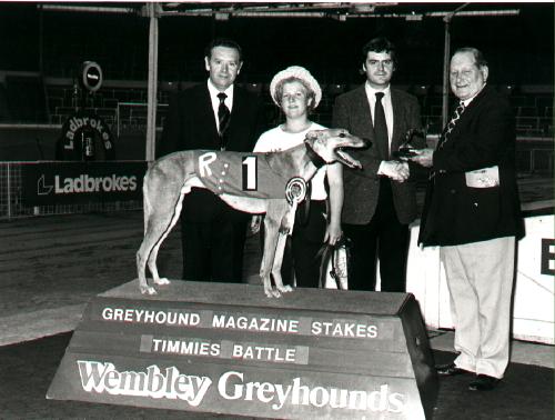 Hen ses her til venstre efter en sejr på Wembley, hvor en af mine pas hunde "TIMMIES BATTLE", som reserve, gik ind og vandt et storløb. Den unge fyr i midten er Adrian Hunt, der var journalist på Greyhound Magazin.