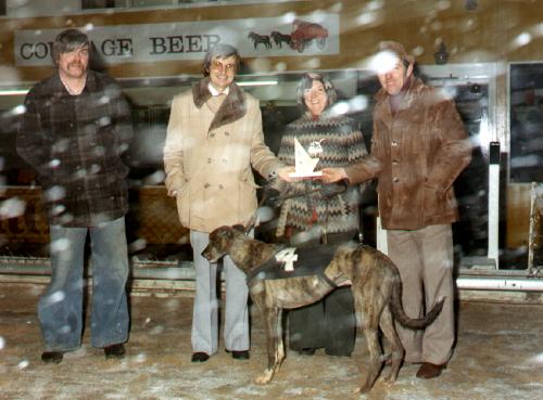 Jeg havde to pas hunde med i finalen - i de otte løb - og de vandt begge to meget overraskende sejre, så jeg havde min andel i denne triumf. Sejrene kom med GLIN GAMBLER og SANDPIPER DOLLY, som jeg er sammen med her i vindercirklen. Hun vandt til 5/1.