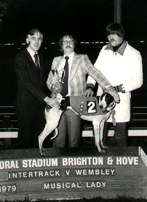 En rigtig kanon hund var MUSICAL LADY, som jeg passede hos Adam Jackson og det var en hund som jeg kørte mange miles med over hele England og vi ses her efter en sejr nede i Brighton, hvor Wembley let slog hjemmebanen i en Inter track match.