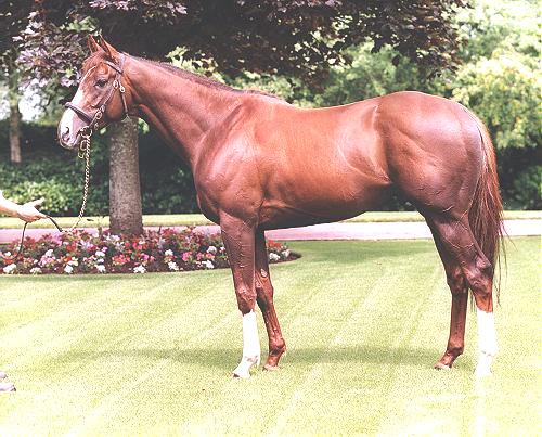 Navnet på denne nyudnævnte superstjerne er GIANT`S CAUSEWAY og den røde hingst med den lange hvide blis og to lange sokker, blev født i USA den 14. Februar 1997 og er opdrættet af Orpendale og Michael Tabor. Den er efter STORM CAT - MARIAH`s STORM/RAHY og var denne hoppes første føl og hun var selv, en over gennemsnittet - "useful" -1800 meters hest i USA med flere Graded sejre som sine meritter.