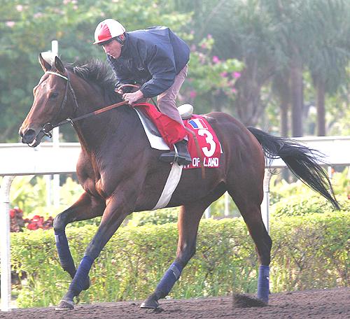 Henri-Alex Pantall`s TOUCH OF LAND er også en meget berejst hest og virker til at være en meget robust type, som så ud til at nyde de første indtryk af banen, men om de 2000 meter i Hong Kong Cup på Søndag bliver for kort må tiden vise, men jo bedre tempo undervejs, jo bedre er det for denne hest.