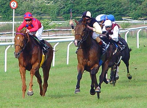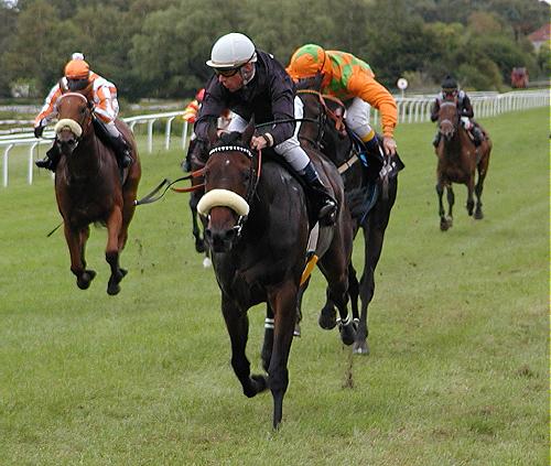LIGHTS OUT var allerede her så stor, at det kneb med at få ham i startboksen og da lågerne åbnede sig, lignede han en hest som overhoved ikke vidst hvad den skulle bruge sine fire ben til. Jockey Yvonne Durant brugte hele den første langside for at få galopperet hesten ind og parret var langt sidst ind i første sving, som blev passeret meget langt ude i banen, men lige så snart de var kommet ind på bagsiden, kom der gang i både benene og den store motor som ligger i heste og vejen frem gik i sjette - syvende spor, hvor de blev rundt opløbssvinget og man stod måbende til og var overbevist om, at nu måtte det være slut.