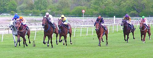 Pludselig kunne man dog se en hest inde ved rails og hurtigt blev man klar over, at den ”sejlede” imod sejren og det var såmænd MERLIN og Sara Slot som havde valgt den korteste vej og lykkedes at slå CAERLESS med en længde.