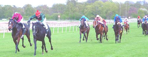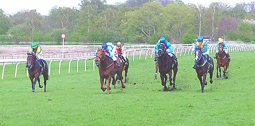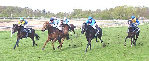 Dagens Amatørløb var meget koncentreret om det skulle lykkes før Patrick Wilson at få et ægte hat trick af sejre og den unge jockey var også helt med fremme (tv) på I`M BACK (Cajun Cadet), da feltet kom ind i opløbet og det var faktisk Patrick, der åbnede ballet.