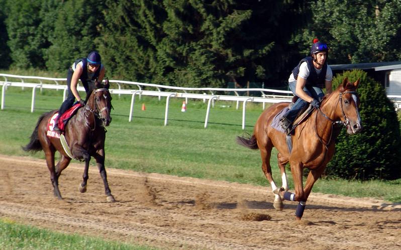 Vi fik lov til at følge arbejdet en formiddag og lod kameraet klikke løs og det er der blevet mange gode billeder ud af og ovenover kan man se SCHIAPARELLI (Monsun), der et par uger senere vandt Tysk Derby, forest i et morgenarbejde sammen med stjernen SOLDIER HOLLOW (In The Wings) og bagefter sørgede træneren selv for en dejlig afkøling.
