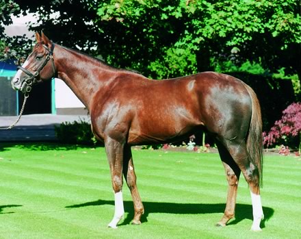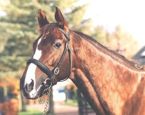 Navnet på denne nyudnævnte superstjerne er GIANT`S CAUSEWAY og den røde hingst med den lange hvide blis og to lange sokker, blev født i USA den 14. Februar 1997 og er opdrættet af Orpendale og Michael Tabor. Den er efter STORM CAT - MARIAH`s STORM/RAHY og var denne hoppes første føl og hun var selv, en over gennemsnittet - "useful" -1800 meters hest i USA med flere Graded sejre som sine meritter.