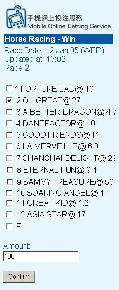Som sidste nye led for at servicerer spillerne i Hong Kong er med hjælp af mobiltelefonen – selvklart – og i kolonien kom man også først frem med dette og der er ingen tvivl om, at det vil forøge den i forvejen meget kolossale store omsætninger og her et par billeder om hvordan det ser ud på de små skærme.