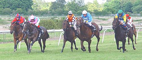 Det var Nicolay Stott (2 fra venstre), som havde ført det meste af løbet med den mindst spillede hest i feltet MR FLEMING (Bin Ajwaad) og langt ind i opløbet var overraskelsen stadigvæk i spidsen og pludselig var det I`M BACK (Cajun Cadet), med Patrick Wilson (th) som angreb mest udvendigt.