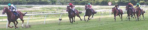 MAGIC FACT og JUBILATION (Zamindar) var de nærmeste og da der mangler omkring 350 meter trak Martinez Lambada hesten ud til angreb og på trods af, at den tidligere Khalid Abdullah hest har vist, at den ikke levere sit bedste på Klampenborg, blev det alligevel til et meget seriøst angreb på den førende hest.