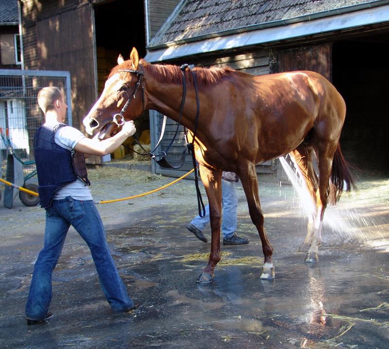 Vi fik lov til at følge arbejdet en formiddag og lod kameraet klikke løs og det er der blevet mange gode billeder ud af og ovenover kan man se SCHIAPARELLI (Monsun), der et par uger senere vandt Tysk Derby, forest i et morgenarbejde sammen med stjernen SOLDIER HOLLOW (In The Wings) og bagefter sørgede træneren selv for en dejlig afkøling.