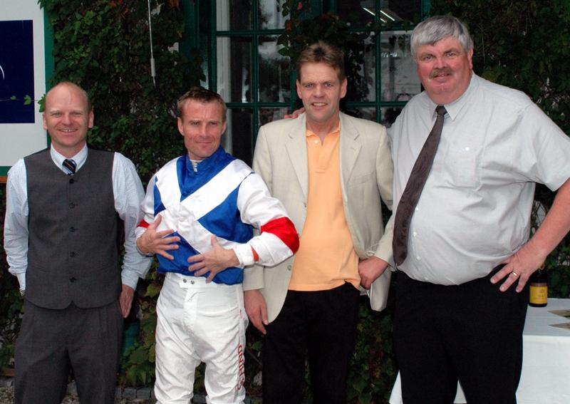 Som deres tyske korrespondent, repræsenterede Bongo ”EBN” i München og overrækker her præmier til træner Axel Kleinkorres samt Jockey Gary Hind og helt til venstre ses München Riem`s sportchef Harald Schneider.